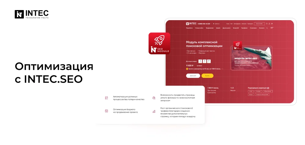 Грамотная поисковая оптимизация — один из ключевых факторов, которые определяют успех и востребованность любого сайта. Команда INTEC предлагает воспользоваться модулем INTEC.SEO, который содержит проверенные инструменты для улучшения SEO-показателей сайта.Что такое INTEC.SEO